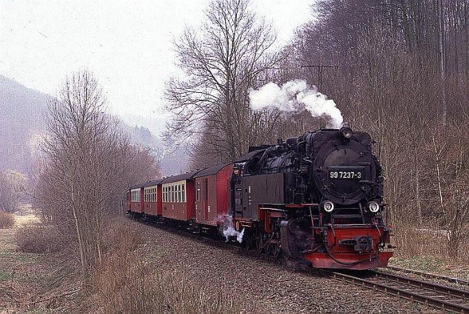 | In photographic terms I'm not sure it comes much better than this! LKM 2-10-2 No.99-7232 crosses the river on the approach to Sorge station with a service train from Wernigerode to Nordhausen. My high opinion of this picture was clearly shared by the owners of a guest house in the region who saw fit to use it on their web-site - a clear violation of copyright as no request had been made to me for its usage. |