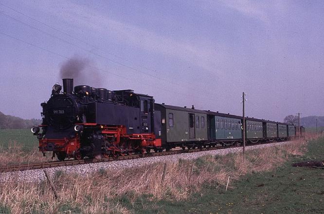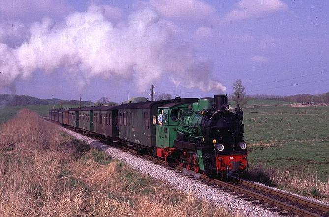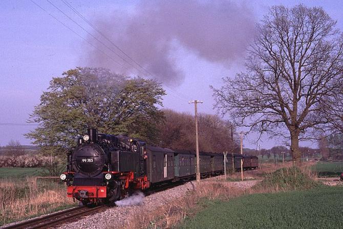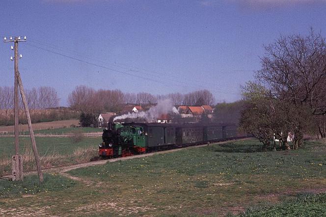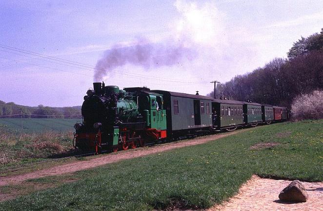 | Two engines are normally sufficient to operate the service and throughout my visit in April 2000 the duties were shared between Mh53 and O&K 2-8-0 No.99-783 which is seen here as it hurries along the final section of the line between Posewald and Putbus. |
