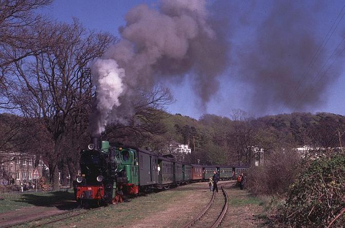 | No.53Mh comes perilously close to smoking itself out as it brings a morning train into Philippshagen station - the first stop on the journey out of Gohren. |