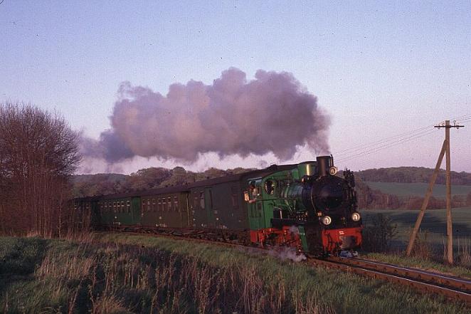 | The sun is rapidly dipping towards the horizon as No.53Mh climbs the bank between Sellin and Garftitz leaving behind a delightful trail of exhaust |