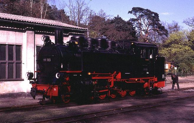 | O&K No.99-783 standing in the yard at Gohren between train. The small driving wheels mean that these locomotives only have a top speed of some 30-35kph which accounts for the long journey times over the railway. The black and red DR livery suits these locomotives splendidly. |