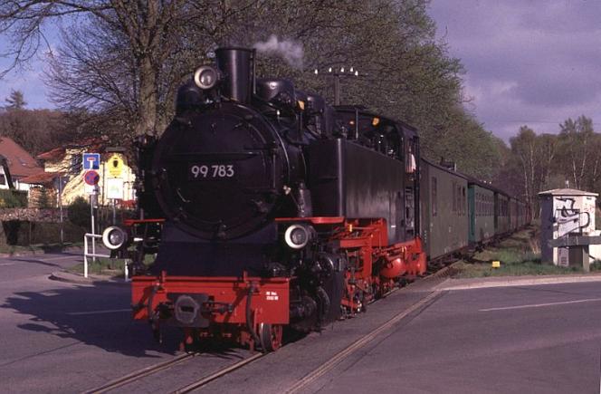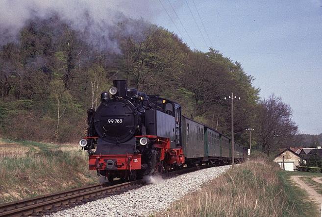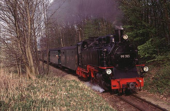 | The rural theme is further emphasised by the sight of No.99-783 as it climbs up through the woods on the approach to Garftitz |