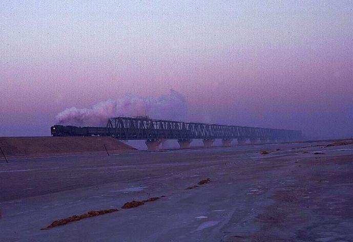 | By the late 1990's there were very few places where steam was still operated on China National Railways. However around Baotou there was still a suburban steam service which operated in early morning and late afternoon. This made photography almost impossible in December but at first light QJ6248 can just be seen crossing the thickly frozen Yellow River with a passenger train 31 December 1998 |
