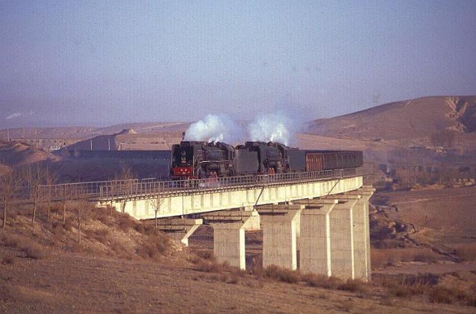 | QJs 1892 and 1611 cross the curved viaduct to the south of Aogaogou station with a long train of empty wagons heading for the mines at Shenmu. In the left hand background can be seen the chimney of Dongsheng power station - one of the users of the coal brought from the mines. |