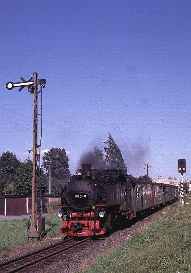 | No.99-749 leaving Olbersdorf station. Although this was a warm summer's afternoon the locomotive is still making plenty of dark black smoke as a result of being an oil burner rather than using coal. |